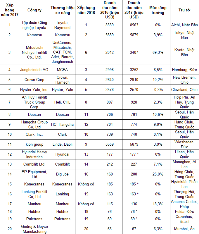 Danh sách 20 hãng xe nâng bán chạy hàng đầu thế giới.